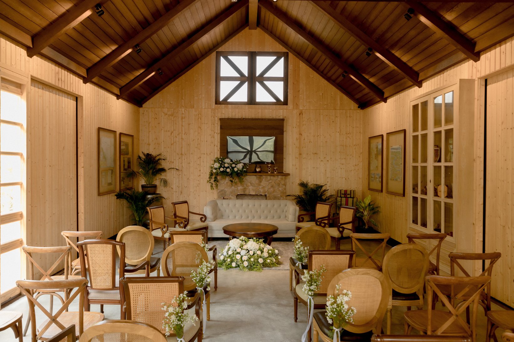 A cozy space adorned with pine wood interiors and a welcoming fireplace, creating a warm and inviting atmosphere. Ideal for private functions, engagement parties, or intimate weddings, it's the perfect setting for crafting cherished memories with loved ones.